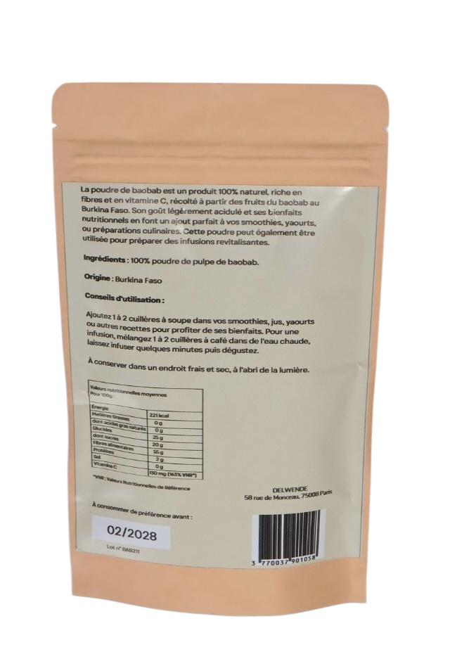 La poudre de baobab est un superaliment naturel issu du fruit du baobab, arbre emblématique d’Afrique. Réputée pour sa richesse exceptionnelle en vitamine C, fibres, calcium et antioxydants, elle est idéale pour une alimentation saine et équilibrée.